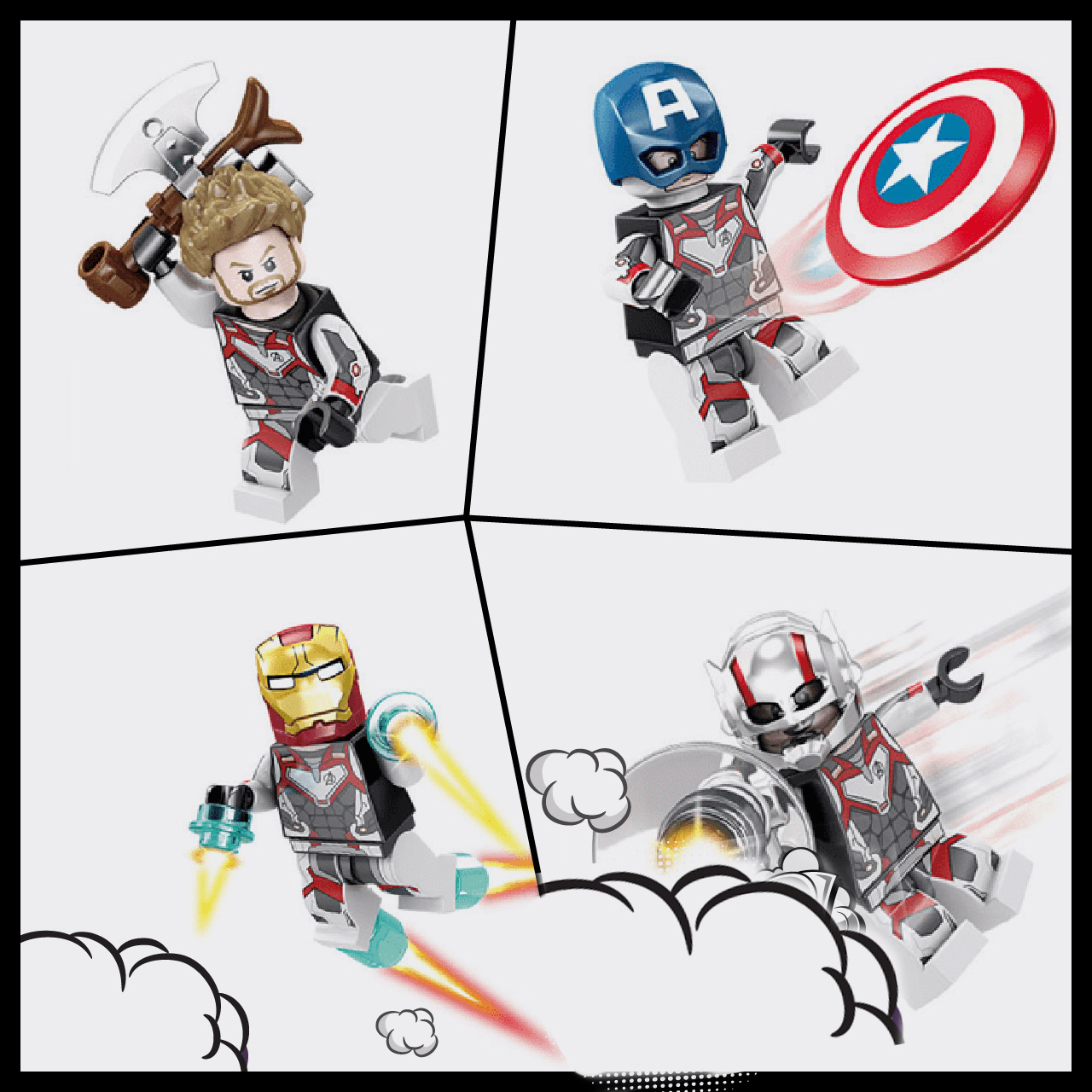 Incluye 8 minifiguras: Rocket, Black widow, Hulk, Ironman, Hawkeye, Antman, Thor y Capitán